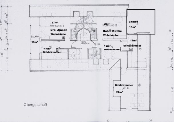 ... liegt im ersten Obergeschoss, gegenüber der Ferienwohnung "Drei Zinnen". Die Gesamtfläche der Wohnung beläuft sich auf ca. 95 qm.
